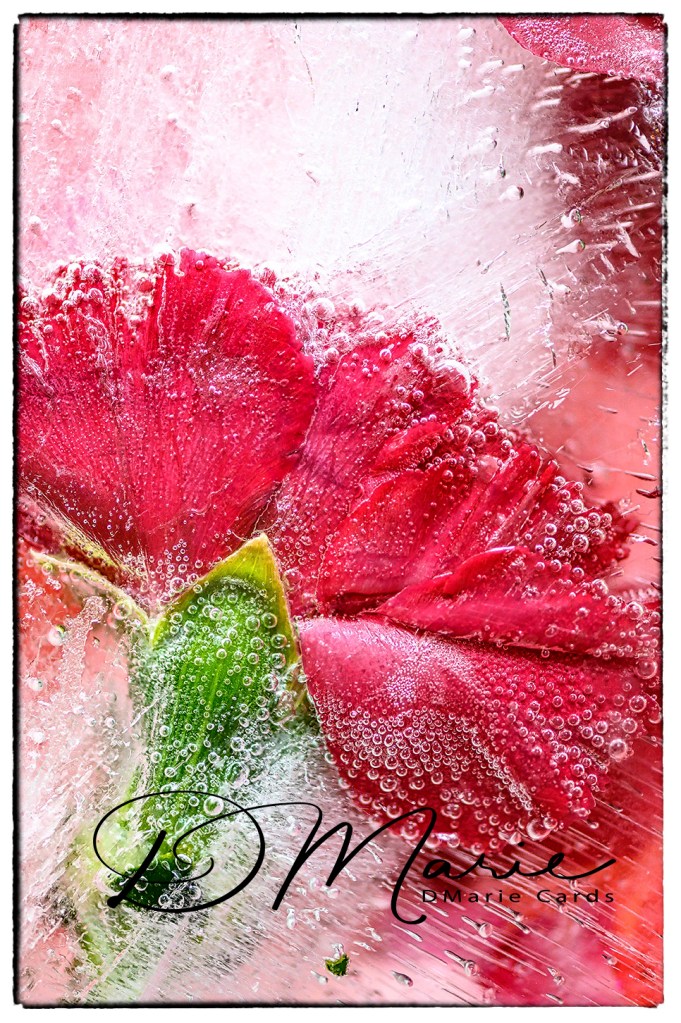 The blue ice is winter in Maine, in fact today is April 5th and the ponds and lakes are still frozen. The temperature at night are still well below freezing and the daytime temperatures are windy with temperature 25 to 30 still cold, cold, cold. But my passion is still creating artistic ice cards indoors and for me this has become a science project. Still having ice fun, so don’t visit Maine in April but do visit Maine in July, August or September it is beautiful state with so many lakes and ponds!